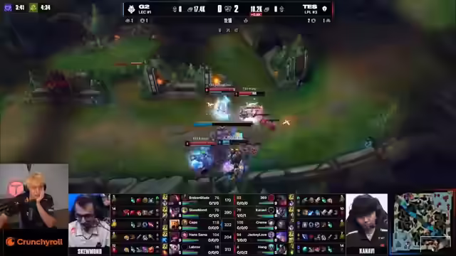 15:41:03Die Lane-Zuweisung von Azir auf Toplane und Xayah/Rakan Midlane wird als Versuch gesehen, eine lange Lane für Orianna zu vermeiden, was für sie tödlicher wäre. Die fehlende Prio auf den Lanes und die Abgabe von Objectives wie Drake und Herald werden als Zeichen für die Dominanz der Chinesen gewertet. Trotzdem wird betont, dass das Spiel noch nicht verloren ist, da G2 über gutes Peeling verfügt. Ein Teamfight, bei dem Caps und Labrov gute Plays zeigen und 1000 Gold für G2 sichern, wird als 'sehr big' bezeichnet, aber Kanavi auf Trundle ist zu stark und erzielt einen Triple Kill, was die Hoffnungen auf ein Comeback zunichtemacht. Die Draft wird als Hauptproblem identifiziert, da Trundle und Aatrox ihre Traum-Matchups erhalten haben. Das Spiel endet mit einer Niederlage für G2, wobei Europa an diesem Tag alle Spiele verliert. Die Analyse nach dem Spiel konzentriert sich auf die Draft-Phase und die verpassten Gelegenheiten, Trundle und Orianna zu kontern, und es wird die Notwendigkeit einer 'Fixed Draft' für zukünftige Spiele betont.