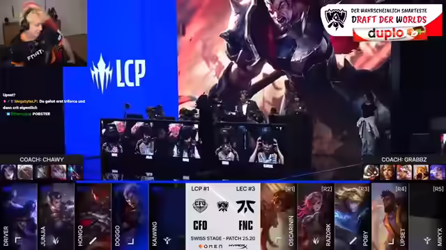 10:18:51Es wurde die Hoffnung geäußert, dass europäische Teams die Swiss Stage überstehen könnten, was bisher noch nie der Fall war. Die Leistung von N.O. am Vortag, die 2:0 gewannen, wurde als positives Zeichen für die europäischen Teams gewertet. Der Start des Spiels zeigte sofort die Schwierigkeiten von Fnatic auf der Botlane, wo das Matchup gegen Caitlyn und Neeko zu einem frühen Verlust von Barriere und einem Flash für Mickey führte. Die Aggressivität der gegnerischen Botlane, die den Klon von Neeko nutzte, um Hooks zu blocken und Druck aufzubauen, machte das Leben für Upside und Mickey zur Hölle. Auch die Midlane entwickelte sich ungünstig, und ein früher Dive auf der Toplane gegen Oskar führte zu einem Solo-Kill, was die Situation für Fnatic weiter verschlechterte. Trotzdem gelang es Oskar, einen Flash des Gegners zu erzwingen, was einen kleinen Lichtblick darstellte. Die Golddifferenz war zu diesem Zeitpunkt gering, und die Roaming-Fähigkeiten der Supports wurden als entscheidend betrachtet.