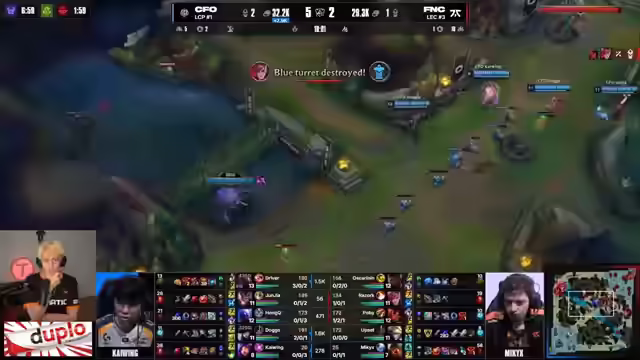 01:56:59Oskars Reaktion auf Drivers Proxy-Farm auf der Top-Lane ist, die Bot-Lane aufzugeben und zum Herald zu rotieren, was als 'richtig scheiße' für Oskar bewertet wird, da er kein Teleport hat. Driver macht Fnatic das Leben zur Hölle und gewinnt den ersten Objektiv-Vorteil. Ein Teamfight um den Herald eskaliert, als Niko eine entscheidende Combo auf zwei Spieler landet, was zum Tod von Pobi und Kessante führt. Das Setup des taiwanesischen Teams wird als viel besser beschrieben, insbesondere Nikos Ult, die den Kampf entscheidet. Es wird kritisiert, dass Fnatic Niko nicht gepickt hat, sondern Ezreal und Kessante, die als 'nicht bad, aber auch nicht useful' bezeichnet werden. Die Herangehensweise von Kyring wird als 'sehr simpel' und 'straightforward' beschrieben. Oskar verpasst erneut eine ganze Wave und damit 250 Gold, was einem Solo-Kill gleichkommt.