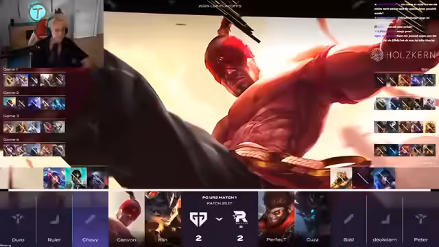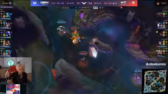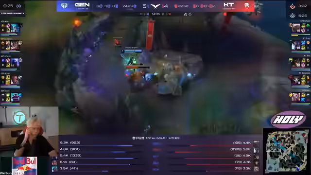 04:12:49Das Early-Game wird von der Kalista dominiert, aber ein Fehler könnte das Blatt wenden. Gen.G dominiert das Early-Game, während BDD Blackfire-Torch kauft. Twisted Fate generiert durch seine Passive zusätzlichen Goldvorteil. Rumble versucht, seinen Hitzebalken aufrechtzuerhalten, um stärker zu werden. Gen.G erzielt einen guten Gang auf der Top-Lane und gibt den Drake ab. Lissandra entgeht einem Angriff mit der Eisernen Jungfrau. Gen.G baut einen riesigen Vorteil auf, ohne aggressive Spielzüge zu benötigen. Der Streamer findet die Hextech-Seele interessant und erinnert an Gen.Gs unschlagbare Performance mit dieser Seele im letzten Jahr. Gen.G nutzte Hextech-Gates, um Ward-Lines zu errichten und die Vision zu kontrollieren, was es dem Gegner schwer machte, sich anzupassen. KT Rolster gewinnt einen Teamfight mit 4-1, wodurch der Gold-Lead von Gen.G irrelevant wird. KT Rolster nimmt zwei Türme ein. BDD spielt überragend und lässt Chovy unsichtbar aussehen. Gen.G tritt nach, während Chovy unsichtbar bleibt. Der Streamer korrigiert sich und sagt, dass der Fehler nicht Chovys Schuld war, da er keine Ultis hatte. KT Rolster kommt von einem dicken Goldlead zu zwei dicken verlorenen Teamfights.