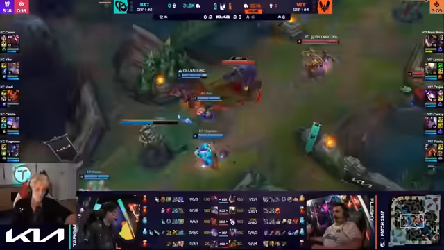 02:17:44Es wird kommentiert, dass Dietz in die Klingel verfehlt ist. Trotz eines Laneswaps ist Keane auf Kamil im Spiel und hat 100 zuerst in 11 Minuten. Der späte Laneshub von K.T. Rollstar wird angesprochen. Keane hat auch einen früheren Land Swap von K.T. Rollstar erwartet. Leona Valle kommt bei einem Kanker Dive zur Geltung. Geiler Kanzler noch obendrauf, by the way, gegen Kamil's E im Hookshot. K-Team mit einem sehr späten Laneshub. Kamil wird bald bei Trifor sein. Das haben wir gerade von Gen.G, was mir sehr gut gefällt. Halt einfach dann in die Carry-Mitte senden. Toplane ist Chobi auch sehr, sehr, sehr, sehr sicher. Katie will hier 5 Mann Topman diven, gefühlt. Beide Seiten liefern sich hier so ein Mexican Stand-Off auf Toplane. Genji will, können sie den Turm halten. Geile Defensive Stärke von Genji, die gerade CB extrem gut tut. Zivir mit Game nimmt eh den Farm von Galo gerne mit. Niemand braucht Gold dringend als Zivir in der Draft hier. Alle vier Champions müssen ja von Zivio unterstützt werden, was vor allem Damage angeht. Da sind wir ehrlich, wenn Zivio tot ist, hat Gen.G kaum Schaden. Zaya spielt hier gegen vier Mehlis und die Galio-Kamil-Kombo ist gegen Zaya komplett useless, weil die ihre Ult hat. Kamil kann sie nicht ulten. In einem Front-to-Back-Team-Fight gibt es kaum bessere Champions als Zaya und Talia.