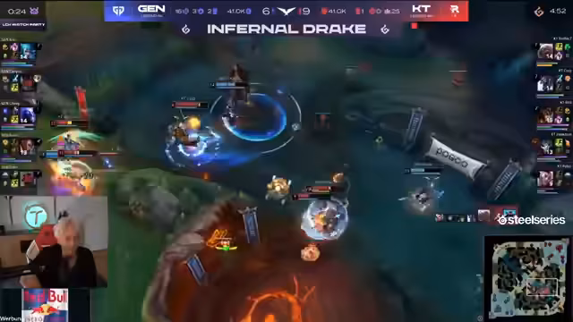 03:25:59KT jagt dem Drachen entgegen, wobei Keens Opfer den Drachen sichert. Die Bubble-Bomben-Kombination von Zoe wird als extrem gefährlich hervorgehoben. Der Streamer fragt sich, in welcher Reihenfolge Shadowflame kritisiert, je nachdem, ob Zoe's Bubble davor oder danach trifft. Vier Mercury-Treats im Spiel deuten auf den Wunsch hin, Zoe's Schläfern zu entgehen. Gen.G versammelt sich um das Areal, aber Katie verfehlt die Zielkasse. Peter versucht einen riskanten Teleport, der misslingt. Chouvi farmt und versucht, den Atakan zu starten, aber KT verteidigt erfolgreich und gewinnt den Fight. KT zeigt eine überragende Leistung, insbesondere im Vergleich zu früheren Spielen gegen Gen.G. Die Drafts von KT werden gelobt, insbesondere der Zoe- und Six-Pick. Duro wird von einem starken Hookflash überrascht, und KT gewinnt den Fight, weil Gen.G overchased. BDD stiehlt einen Kill mit Flash und KT sichert sich den ersten Play Richtung des Atakans. KT sichert sich den Drake, und die Hextech-Soul wird wahrscheinlich folgen.