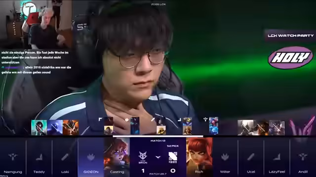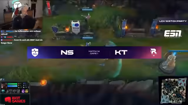 03:17:36Vor dem Start der LCK-Serie wird die aktuelle Form der Teams analysiert. KT steht mit 2-0 an der Spitze der Liga nach Siegen über T1 und Gen.G. Der Streamer äußert die These, dass es im Stil von KT wäre, nach diesen Erfolgen gegen Nongshim Red mit 2-0 zu verlieren, da es eine Tradition sei, solche Spiele zu verlieren. Die Aufstellung der Teams wird betrachtet, mit besonderem Fokus auf die Picks wie Pantheon für KT und Jarvan IV für Nongshim Red, wobei der Pantheon-Pick als sehr stark bewertet wird.