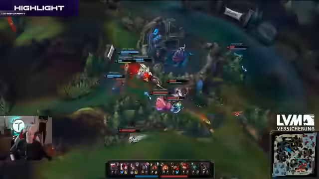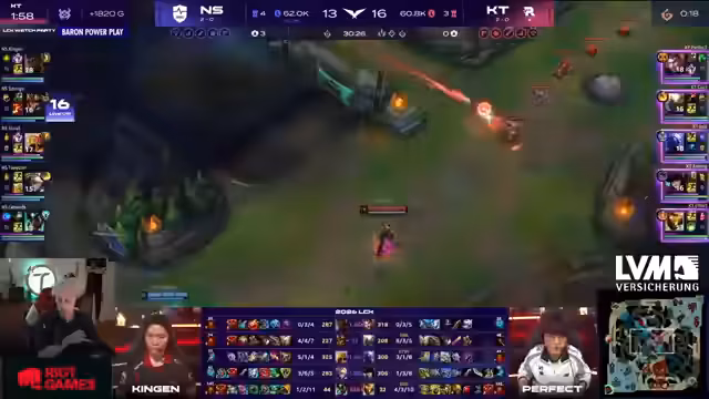 04:54:02Der Fokus liegt auf einem Kampf um den Baron Nashor. Ein Knock-Up von KT führt zu einem engagierten Fight, bei dem die Skillshots von Six verfehlen und die Situation chaotisch wird. Nach dem Kampf wird der Baron von Longshot kontrolliert. Ein Fehler von Sponge (KT), der zu tief positioniert ist, wird als kritischer Punkt angesehen. Der Streamer hält es für unwahrscheinlich, dass KT den Kampf hätte gewinnen sollen.