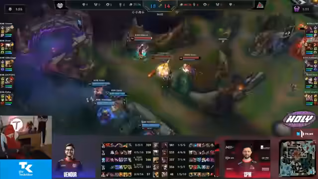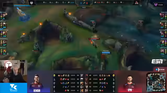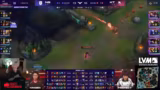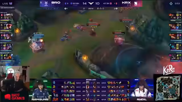 01:12:32Die 'Bros' (das Team des Streamers) zeigen in Game 1 eine dominante Leistung. Sie führen einen Teamfight Mitte mit einem 2 zu 2 Trade für sich, gewinnen dabei aber die Objectives. Eine Invasion auf der zweiten Krabbe schlägt fehl, was aber aufgrund ihrer starken Top- und Bot-Lane ausgeglichen wird. Im späteren Verlauf des Spiels dominieren die Bros einen großen Teamfight, eliminierten mehrere Gegner und besiegten schlussendlich das Nexus von DRX mit einem Pentakill des Generals, um den ersten Sieg einzufahren.