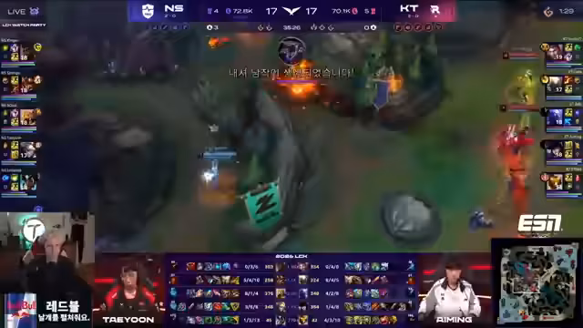 03:52:36Nach einem erfolgreichen Fight um den Baron Nashor erleidet KT eine katastrophale Niederlage. Es wird detailliert beschrieben, wie KT in der folgenden Situation einen Teamfight verliert. Nachdem KT den Nashor nimmt, starten Nongshim Red einen überraschenden Angriff, der den Pantheon von KT sofort eliminiert. KT reagiert zu langsam und kann nicht kontern, wodurch Nongshim Red den Nashor stiehlt und vier Teammitglieder von KT tötet. Dieser Fehler wird als spielentscheidend bewertet, da KT das Momentum vollständig verliert.