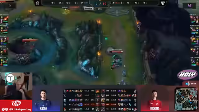 07:18:25Das Early Game ist sehr intensiv und nervenaufreibend, da der Ausgang entscheidend ist. Tokimo überlebt eine kritische Situation dank seines Passivs und Engages als Alistar, was ihm und seinem Ezreal einen Double Kill gegen die Gegner-Bot-Lane einbringt. Sein aggressiver Spielstil und die Nutzung des Passivs in kritischen Momenten sind hier der Schlüssel zum Erfolg.