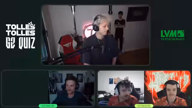 09:55:29Das Quiz beginnt. Die erste Kategorie ist 'Steckbrief'. Die Teams müssen anhand von Teamkollegen einen Profispieler identifizieren. Nach einer kurzen Beratung und mehreren Tipp-Gaben hat Shafy die richtige Antwort erkannt und als Antwort 'Lavrov' genannt. Das Team G2Nord damit den ersten Punkt. Der Streamer lobt die Leistung und das schnelle Raten. Anschließend wählt Team G2Main die nächste Kategorie 'Imposter' aus.