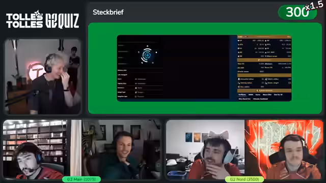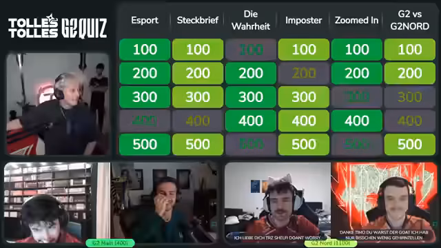 10:52:37Der Fokus liegt auf der Durchführung verschiedener Quiz-Kategorien, darunter 'Steckbrief' und 'eSport'. In der Kategorie 'eSport 500' gewinnen die Teilnehmer 1000 Punkte durch die korrekte Antwort zur Umbenennung von 'Gamers 2' zu 'G2' im Jahr 2015. Der Streamer kommentiert die Schwierigkeit der Fragen und die Performance der Teams, besonders die von Shelfi, der in den Posterfragen stark auffällt.