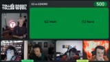 10:40:05In der 'Esport'-Kategorie müssen die Teams die Anzahl der europäischen Titel von G2 in den letzten sechs Jahren nennen. Shafy gibt 11 an, was falsch ist. Nach kurzer Ratschlag und Erinnerung an die verschiedenen Saisons und anormale Turnierformate, wie die 'Season Finals', gibt er als Tipp 13 an. Dies ist ebenfalls falsch. Die richtige Antwort sind elf Titel, ein Fehler des Streamers, der später korrigiert wurde und den Punkt an G2Nord ging.