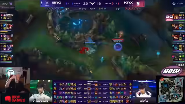 02:40:04Nach mehreren Skirmishes und dem Verlust mehrerer Türme vergrößert sich der Goldvorteil von DRX erheblich. Der Kommentator zeigt sich besorgt über die anhaltende Drucksituation, insbesondere weil DRX den nächsten Drake kontrolliert und die Bros es nicht schaffen, den Fokus vom Dragon zu nehmen. Anstatt sich auf einen Teamfight zu konzentrieren, scheint Teddy auf dem Drachen zu fischen, was als 'nicht klug' eingestuft wird. Dies führt dazu, dass die gesamte Botlane von DRX ausradiert wird und DRX mit einem riesigen Goldvorsprung in die mittlere Spielphase geht. Das Spiel läuft damit für die Bros sehr ungünstig ab.