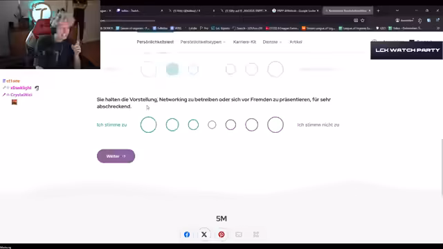 01:56:42Nach dem turbulenten Spiel schaltet der Streamer auf ein Alltags-Thema um. Er diskutiert einen Tweet über Faker und dessen Persönlichkeitstyp (ENFP). Daraufhin führt der Streamer einen eigenen Persönlichkeitstest durch und gibt seine Typisierung als Steinbock an. Die Unterhaltung ist locker und beschäftigt sich mit seinen Eigenschaften und Abneigungen, wie Networking und sein Interesse an komplexen Konzepten im Vergleich zu schlichten.
