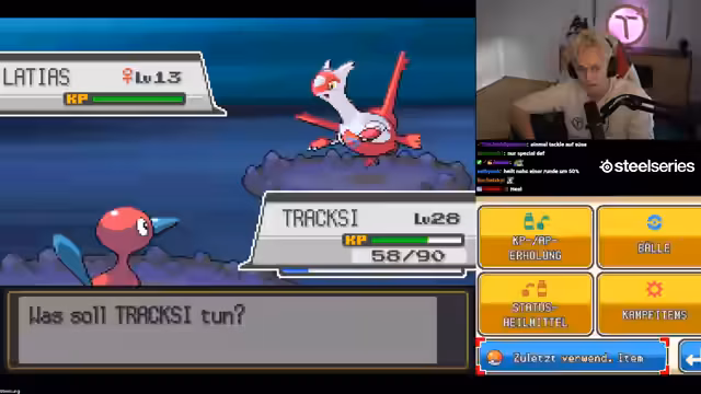 05:07:54Der Streamer befindet sich in einem Pokémon-Kampf und steht vor der Herausforderung, das legendäre Pokémon Latias zu fangen. Er diskutiert die Strategie mit seinem Chat und entscheidet sich für den Einsatz von Tackle als safe-Angriff, da Latias tanky ist. Nach einigen vergeblichen Versuchen mit einem Pokéball gelingt es ihm schließlich, Latias zu fangen, was er als sehr glücklich und einzigartig bezeichnet. Er zeigt sich begeistert von der Möglichkeit, auf Latias zu reiten und hebt seine Stärke als legendäres Pokémon hervor.