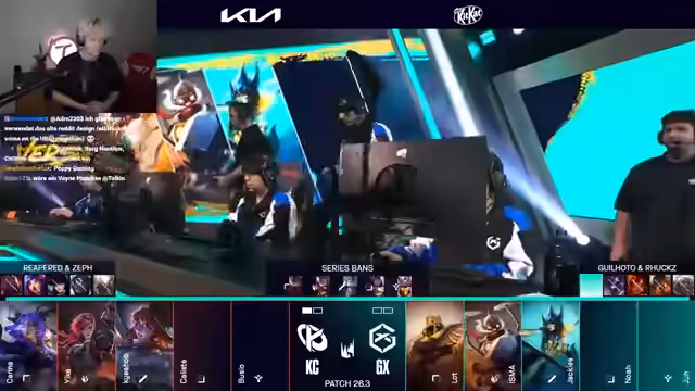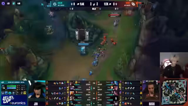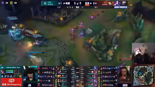 02:10:25Im weiteren Verlauf des Spiels zeigt KC seine typisch, sehr ruhige und methodische Spielweise. Der Streamer vergleicht KC mit einem Budget-Gen.G. Der Jungler Wouter übt konsequent Druck auf der Top-Lane aus, während die Bot-Lane, die dominant beginnt, Prio für Objekte wie den Drachen sichert. Galio wird als großer Faktor identifiziert, der gegnerische Magic Damage absorbiert und so dem Team großartige Teamfight-Situationen ermöglicht. KC holt verschiedene Objive und baut einen soliden Goldvorsprung auf, während Giant X sichtlich ideenlos und desorientiert wirkt.