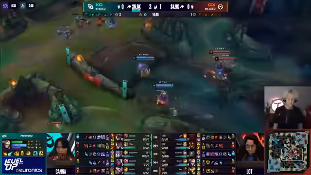 02:24:14Giant X macht in einem entscheidenden Teamfight um den Drachen einen kritischen Fehler. Ein Spieler greift den 800-Gold-Bounty an, ohne Smite zur Verfügung zu haben, was einem sicheren Drachen für KC entspricht. KC nutzt diesen Vorteil und weitere Fehler von Giant X, um das Spiel zu beenden. Giant X zeigt im späteren Verlauf des Spiels keinerlei klare Ziele oder proaktives Spiel, während KC sein Macro-Spiel perfekt durchzieht und den Nexus ohne größere Probleme nimmt. Das Spiel endet mit einem klaren Sieg für KC.
