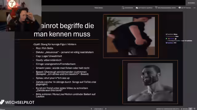 02:30:02Nach dem Interview wechselt der Fokus zur Präsentation von erstellten Inhalten. Zuerst wird ein PowerPoint von Julia gezeigt, das verschiedene Memes und Trends aus dem Internet behandelt. Dazu gehören Tier-Listen, He-Me-Out-Trends wie Sigma und Alpha, das Konzept des 'Smash or Pass' sowie der Trend der trainierten Unterarme. Der Streamer kommentiert diese Trends und bemerkt, dass viele Meme-Begriffe wie 'Cap' oder 'Beta' aus dem Urban Dictionary stammen und sich im Wandel befinden.