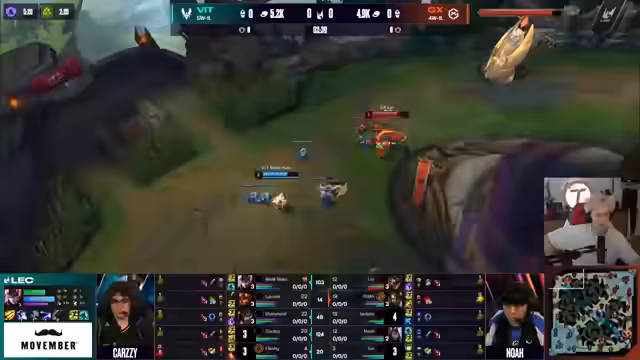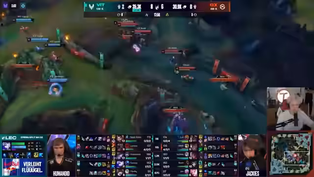 07:37:33Fatality nutzt einen Nashor-Power-Play mit 3.500 Ocken in der LEC, was selten vorkommt. Quinn segelt auf der Karte umher, um Vision zu gewähren und Schaden zu verursachen. Kasi zeigt erneut beeindruckende Tank-Fähigkeiten als Caitlyn und überlebt mehrere Fähigkeiten dank der Barriere. Vitality nutzt clever Drafts und ihre explosivität, um Giant X unter Druck zu setzen und ihre Identität als kreatives Team zu manifestieren.