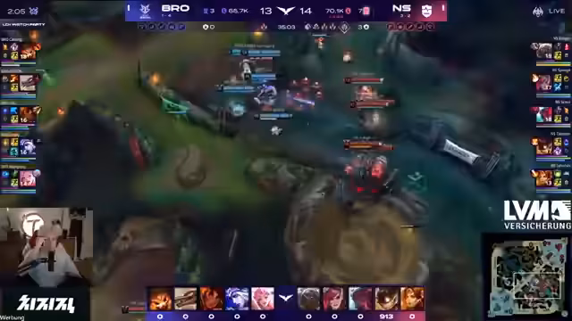 02:12:04Im Mid-Game diskutiert der Streamer die Teamkämpfe und die Rolle der Champions. Er kritisiert die für unsinnigen Ults der Bros, die sie Teamfights verlieren lassen. Trotzdem gibt es Hoffnung durch den Nashor-Debuff und Bounties. Der Streamer betont die Wichtigkeit von gemeinsamem Play und Kommunikation, aber auch die Risiken von zu viel Risiko in den Fights.