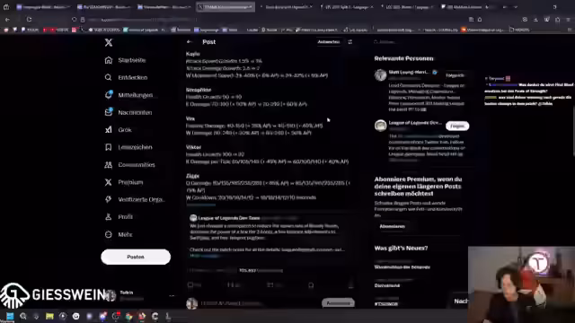 00:02:14Der Stream startet mit einer Begrüßung des Twitch-Chats und einem Gespräch mit Traxi über dessen Climb in der Season. Es wird über das Kennenlernen der Season, das Abwarten von Tiltern und Early Climbern gesprochen. Der Streamer erwähnt sein Frühstück und die bevorstehende Solo-Queue Session. Es wird über ein Update gesprochen, wobei der Streamer sich auf Twitter-Informationen von Froxon bezieht, insbesondere zu Nerfs von Petals und Boots. Er kritisiert Robin für ungenaue Patchnotizen und äußert seine Meinung zur Winrate von Items als Bewertungsgrundlage. Der Fokus liegt auf Gold-Effizienz und Synergie mit Champions, nicht auf Winrate. Abschließend werden Co-Streams für die LCK, LEC und ausgewählte LPL-Spiele angekündigt, wobei die LCK aufgrund der Zeitzone Vorrang hat.