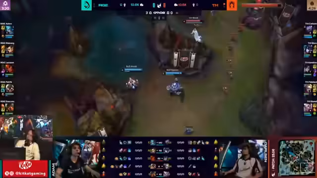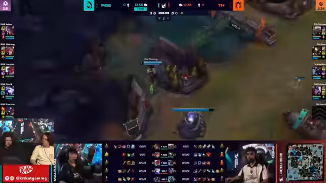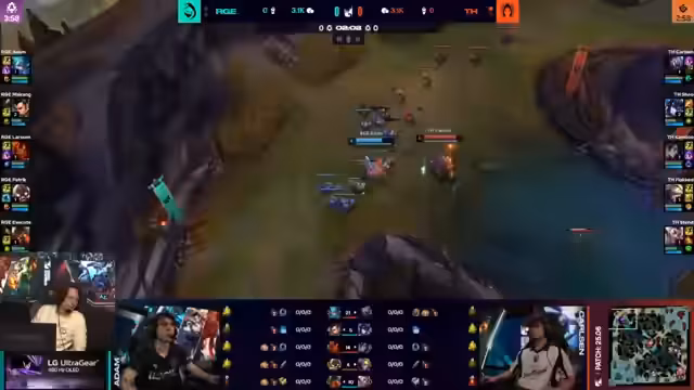 03:12:05Ein entscheidender Teamfight findet statt. Geo, ein Spieler, hat keinen Flash und seine Ultimate zur Verfügung und wird eliminiert, was als guter Play des Gegners bewertet wird. Das aggressive Vorgehen des Gegner-Teams, insbesondere ein Engage von Rogue, wird als krank und effektiv gelobt, da der Gegner keine direkte Gegenmaßnahme hat und zahlenmäßig unterlegen ist. Ein geglückter Port onto Bot ist der Schlüssel zu diesem Vorteil.