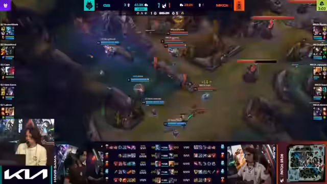 05:42:42Nach der Mid-Lane-Dominanz von G2 beginnen die Teams mit den Drachenkämpfen. G2 hat einen klaren Vorteil, da Caps Druck auf der Map erzeugen kann und die Gegner mit seinen Fähigkeiten und der Map-Kontrolle überfordert sind. Mophis kämpft sich jedoch zurück und verteidigt mehrere Drachen erfolgreich. Die Kommunikation von Mophis und die Koordination ihrer Bot-Lane erlauben es ihnen, den Druck zu widerstehen und sich zu consolidieren.