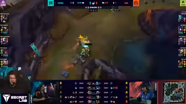 00:36:42Das Spiel beginnt und Giant X startet mit einem Level-1-Invasionsversuch im Jungle von Fnatic. Der Jungle Razork von Giant X will eine Map-Kontrolle erlangen, wird jedoch von Isma (Fnatic) auf frischer Tat ertappt. Es kommt zu einem early Fight, bei dem Isma zwar den ersten Kill des Splits holt, Razog aber dennoch Vorteile daraus ziehen kann, indem er einen Drake sichert und den Golduntreich gering hält. Das early Game wird von intensiven Jungle-Trades und Map-Kontrolle geprägt.