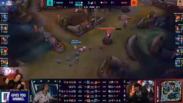 06:54:29Ein unerwarteter Engage von Alvaro kostet ihm das Leben, als er sich vor Tolkien in den Tod wirft, was zu einer Pause führt. Es wird spekuliert, dass Alvaro's Gehirn ausgetauscht werden muss. Sein Misplay wird im Chat kritisiert, da er zuvor behauptet hatte, der beste AD-Carry Europas zu sein. Er verliert Harald und opfert seinen Support und Toplaner, was negativ bewertet wird. Trotzdem wird sein selbstbewusstes Auftreten als unterhaltsam und emotional angesehen. Ein schöner Engage von Mobbystar führt dazu, dass Varus permanent rooten kann, was als OP angesehen wird. Der Fight endet mit einem 3-für-1 für Mobbystar. Varus verursacht viel Schaden und Azir holt sich einen Double Kill. Mobbystar bereitet sich darauf vor, den Drachen zu holen. Das Spiel wird sich voraussichtlich lange hinziehen, da keines der Teams viele Engage-Möglichkeiten hat. Varus' Sheriff Corruption zwingt zum Rückzug, der jedoch von Azir gestoppt wird.