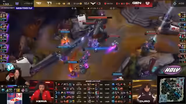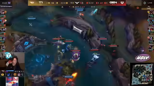 00:30:22T1 gerät in Game 1 trotz der hohen Kill-Zahl in einen kritischen Zustand. Zwar besitzt Smash 15 Kills, doch Gen.G kontrolliert die Objektive und führt in Gold. Die starken Picks von Gen.G, insbesondere Elise, lassen Smash im Late Game keine Chance, das Spiel im Alleingang zu entscheiden. T1 kann jedoch durch exzellentes Teamfighting umher. Entscheidende Kills auf Gen.G-Carries und der Einsatz von Kerias Poppy-Ultimum wenden das Spiel zu Gunsten von T1. Mit einem Triple Kill für Kaiser gewinnt T1 überraschend den ersten Satz.