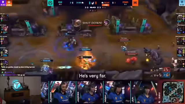 12:40:23Fnatic wird für den verdienten Sieg gelobt. Es wird kritisch angemerkt, dass das Gameplay im professionellen League of Legends zu ruhig geworden ist, da Soul und Baron als Comeback-Möglichkeiten kaum noch existieren. GiantX fällt dadurch in der Tabelle, befindet sich aber noch in einer guten Playoff-Position. Der Stream bereitet sich auf ein Interview mit den Spielern von Fnatic vor.