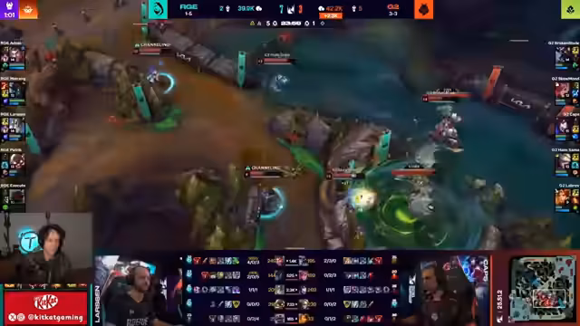 13:23:44Gegen Ende des Streams wird eine Fehleranalyse des Spiels vorgenommen. Es wird kritisiert, dass Rogue nach einem erfolgreichen gank auf dem Top-Roten einen Follow-up verpasst und den Drachen verloren hat. Der J-Support von Rogue wird dafür kritisiert, zu spät zu ulten und so die Chance, aus dem Gewinn einen größeren Vorteil zu machen, zu verschenken. Diese kleinen Fehler führten am Ende zu der Entscheidung des Spiels, obwohl G2 in den entscheidenden Momenten die bessere Ausführung zeigte.