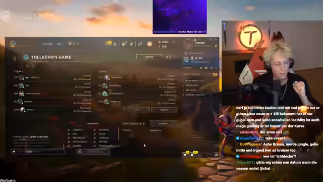 05:21:46Zu Beginn des Streams werden die Champions und Strategien für das bevorstehende Turnierspiel besprochen. Der Fokus liegt auf der Champions-Auswahl, Items und der Teamkommunikation. Es werden spezifische Fähigkeiten erklärt, wie beispielsweise die Passive von Mundo, die das Blocken von Spells ermöglicht. Dem Spieler Taschi wird geraten, dreimal den Gürtel des Riesen zu kaufen, um stark zu werden. Die Teamstrategie beinhaltet gezielte Ganks, insbesondere in der Mid-Lane, um dem Gegner einen Vorteil zu verschaffen und so das Spiel zu dominieren.
