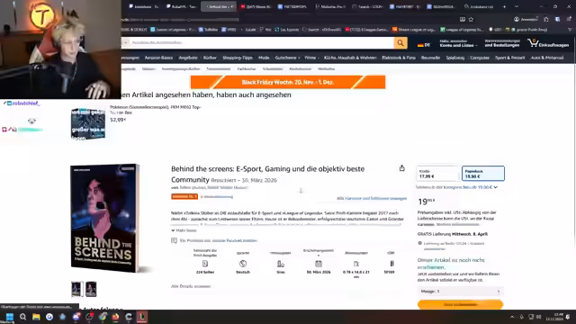 11:26:13Der Streamer nutzt die Pause, um auf sein neu erschienenes Buch aufmerksam zu machen. Es ist ein Bestseller in den Kategorien Medienforschung und Medienbranche. Er bittet die Zuschauer, das Buch bei Thalia oder Amazon zu kaufen, um das Besteller-Ranking zu unterstützen. Die Vorfreude auf das Buch wird thematisiert und die Entstehungsgeschichte wird kurz angerissen.