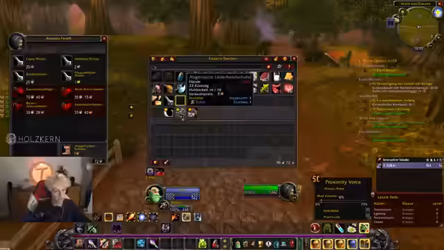 08:53:11Der Streamer klagt über ein volles Inventar aufgrund von Westfals-Gegenständen und gebraucht einen großen Beutel. Er erlangt durch einen Trade mit einem Priester einen großen Zauberstoff. Er ist auf der Suche nach neuen Fähigkeiten wie 'Schwerlandverbrennen' und droppt Items, um Platz zu schaffen. Er lootet einen Roben und ist immer noch ein Stück vom Ziel entfernt.