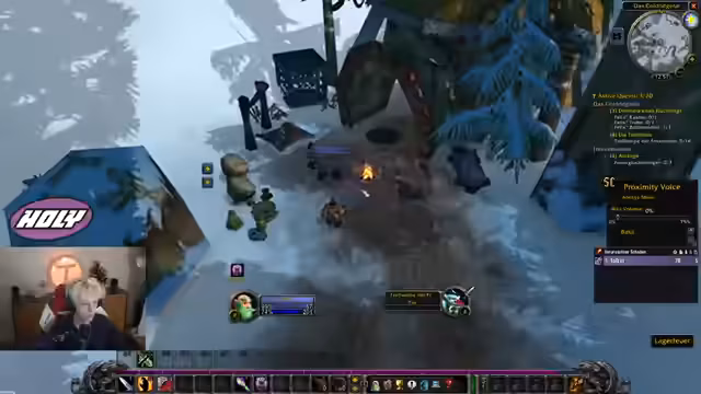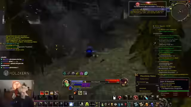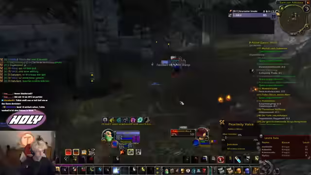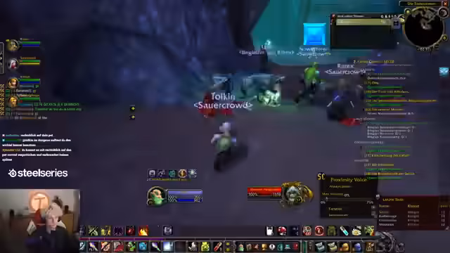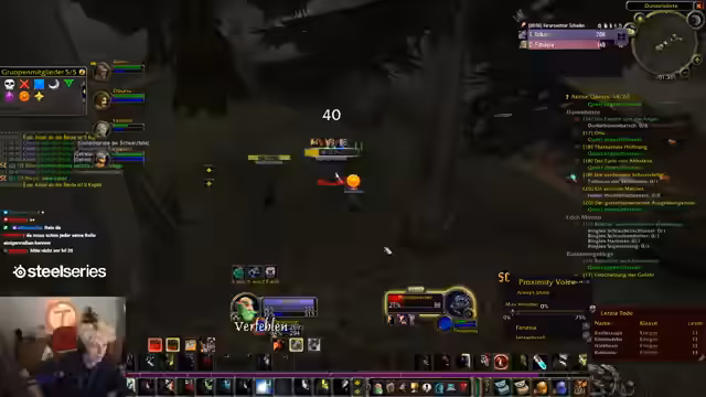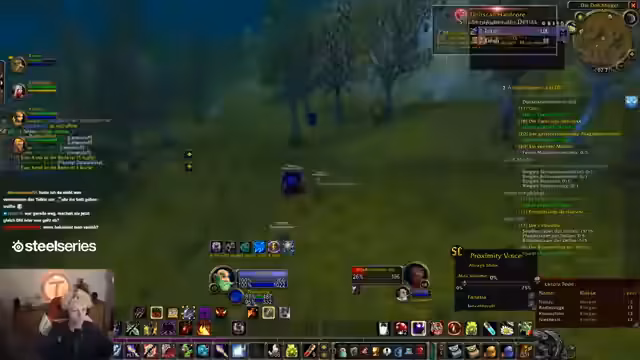 00:59:03Nachdem der Streamer die Einladung zur Sauerkraut-Gilde angenommen hat, erscheint der Gilden-Chat. Es werden technische Fragen zum UI-Fenster und zum Chat-Filter gestellt. Die Mobs werden mit den ersten Zaubersprügen wie "Schattenblitz" bekämpft. Es wird deutlich, dass die Level-Erfahrung durch die hohen Spielerdichten in den Layern variiert und dass die Koordination über den Discord-Chat essenziell ist.