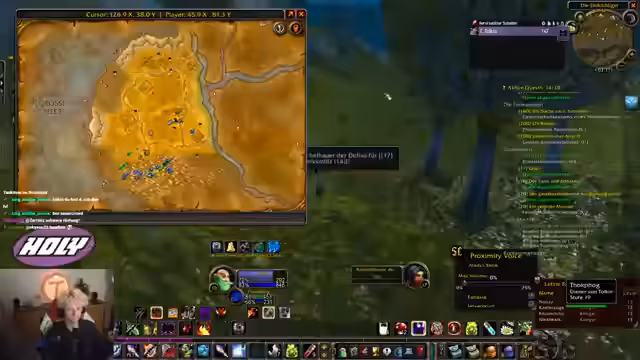 01:17:16Ein bedeutender Moment ist die Entdeckung, dass die Add-ons der Sauerkraut-Gilde beginnen zu funktionieren. Der Streamer kann nun auf der Minimap die Positionen seiner Gildenmitglieder sehen, was die Koordination deutlich verbessert. Er nutzt dieses Feature, um zu sehen, wo sich seine Freunde befinden und sich zu orientieren. Gleichzeitig schaut er sich die Umgebung an, stellt aber fest, dass man die Darstellung der Symbole anpassen muss, da sie den Bildschirm überladen.