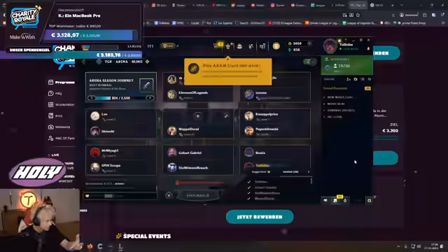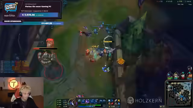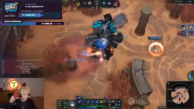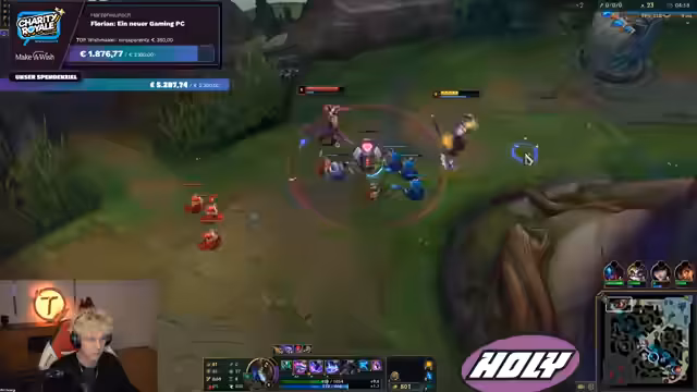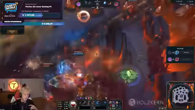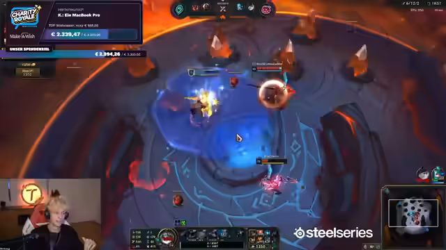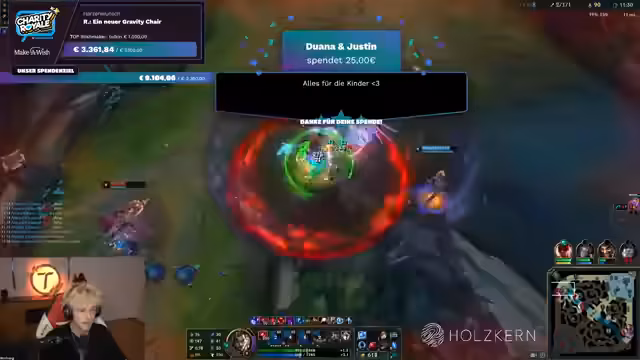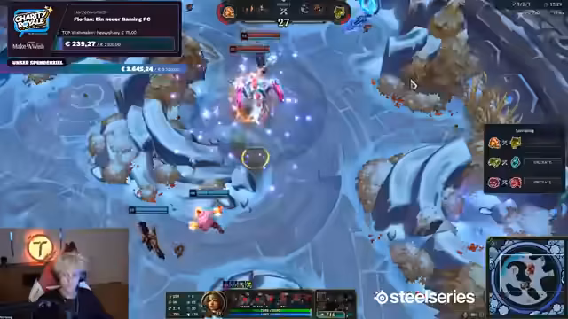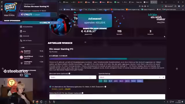 01:47:29Der Streamer setzt seine Spendenaktion für Make-A-Wish fort, wobei er für jeden Tod in der Arena-Runde 50 Euro spendet. Er rechnet schnell aus, dass bei mehreren Toden hohe Summen zusammenkommen könnten, was die Spannung für die Zuschauer erhöht. Es wird erwähnt, dass bereits 500 Euro gesammelt wurden und die Möglichkeit besteht, bis zu 700 Euro zu erreichen, sollte das Team verlieren. Zusätzlich wird ein zweites Projekt namens Florian vorgestellt, für das ebenfalls Spenden gesammelt werden. Die Zuschauer werden ermutigt, sich an der Charity-Aktion zu beteiligen, wobei ein Zuschauer namens Niki bereits 300 Euro zugesagt hat. Die Interaktion mit den Zuschauern ist hoch, da sie aktiv mitrechnen und die Aktion unterstützen.