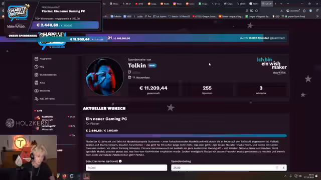 02:21:07Der Streamer gibt detaillierte Informationen über Florian, das Kind, für das gesammelt wird. Florian ist zehn Jahre alt und leidet an Muskeldystrophie Duchenne, was ihn an den Rollstuhl fesselt. Da körperliche Aktivitäten nicht mehr möglich sind, sind Lego bauen, Monster Trucks und Online-Gaming mit Freunden, insbesondere Farming Simulator, wichtige Freizeitbeschäftigungen für ihn. Es wird ein Gaming-PC mit Monitor und Zubehör im Wert von 2.000 Euro benötigt. Der Streamer betont die Relevanz dieses Ziels angesichts der niedrigen Lebenserwartung bei Muskeldystrophie. Er kündigt eine neue Challenge an: Für jeden Nasus-Stack spendet er 1 Euro. Dies soll die Zuschauer motivieren und gleichzeitig eine unterhaltsame Möglichkeit bieten, Spenden zu sammeln. Die Aktion hat bereits 4.000 Euro von 95 Spendern gesammelt, und das Ziel ist es, zwei Wünsche zu erfüllen.