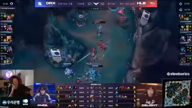 00:39:03Immer noch im Baronnashor, kommt es zu einem Entscheidungskampf. Lazyfeel von HLE versucht, DRXs wichtigstes Ziel, den Nexus, anzugreifen, während DRX den HLE-Angriff abwehren muss. Viper von DRX gelingt es, mit der richtigen Reaktion und einem aggressiven Flankangriff einen Teil des HLE-Teams auszuschalten. Dennoch kann Lazyfeel den Nexus mit einem perfekt gesetzten Javelin Toss und letzter HP zerstören, was HLE den Sieg sichert und eine dramatische Serie beendet.