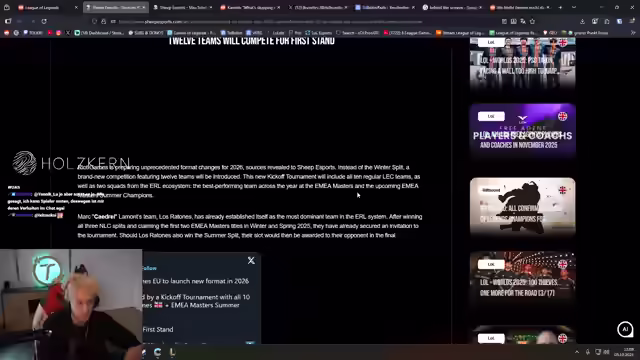 04:10:46Es wird über das NNO-Line-Up für ein Red Bull Event gesprochen, bestehend aus Toiki, N.A.G.U.R.I.N., Freddy, Bruecki und Kani, die gegen T1 und ein weiteres Team spielen werden. Es werden verschiedene Fun-Modi erwähnt, wobei noch unklar ist, auf welchem Patch gespielt wird und ob Arena verfügbar sein wird. Bezüglich Merch wird erwähnt, dass es vor Ort von verschiedenen Teams viel geben wird, aber keine Details bekannt sind. Es wird ein Tweet von Sheep Esports erwähnt, der besagt, dass sich beide nationale League of Legends-Teams mit der LEC messen dürfen, da Riot Games ihr LEC-System für Anfang 2026 ändern möchte. Der Wintersplit wird durch ein neues Format, ein Kick-Off-Tournament, ersetzt, bei dem zwei Teams aus der ERL teilnehmen werden, darunter Los Ratones und das Gewinnerteam der EMEA Masters. Es wird betont, dass dies ein wichtiger Schritt für nationale Teams ist, sich auf einer größeren Bühne zu zeigen.