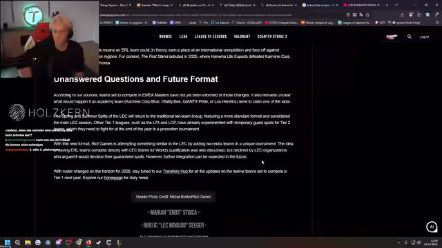 06:16:07Die geplanten Änderungen in den ERL-Ligen werden kritisch diskutiert, wobei die kurzfristigen Vorteile für die LEC hervorgehoben, aber die langfristigen negativen Auswirkungen auf die ERLs betont werden. Es wird die Frage aufgeworfen, ob die Teams überhaupt in die Entscheidung einbezogen wurden, und die Information, dass fast alle Teams gegen die Änderungen gestimmt haben sollen, wird als Indiz für problematische Entscheidungsprozesse bei Riot Games gewertet. Es wird spekuliert, dass Riot die Änderungen trotz des Widerstands der Teams durchsetzen könnte, wenn sie kurzfristig zu höheren Zuschauerzahlen führen. Die Situation wird mit einer Partnerschaft in Nordkorea verglichen, was die fehlende Mitsprache der Partner verdeutlicht. Es wird angedeutet, dass die Wohlwinter-Liga möglicherweise nicht offiziell zur DC zählt, was Riot mehr Spielraum bei den Änderungen gibt. Abschließend wird der Fokus auf das bevorstehende Spiel gelenkt, mit dem Ziel, durch einen 2:0-Sieg die Weichen für den Aufstieg zu stellen.