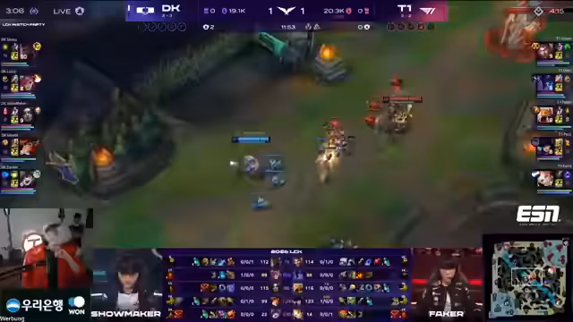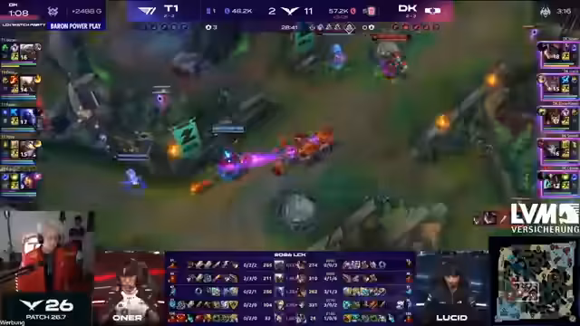 03:07:19Im späten Spiel verliert T1 den entscheidenden Fight um den Elder Dragon. Faker stirbt ohne TP, was T1 die Möglichkeit nimmt, das Spiel noch zu drehen. Damwon nutzt ihre überlegene Map-Kontrolle und Vision, um den Elder Dragon zu kontrollieren und den Turm zu pushen. Trotz kleinerer Fehler zeigt Damwon insgesamt eine überlegene Leistung und gewinnt das Spiel mit 1-0. T1 kämpft mit Inkonsistenzen in der Regular Season und hat gegen Top-LCK-Teams wie KT, Gen.G und Damwon verloren, was ihre Championship-Chancen in Frage stellt.