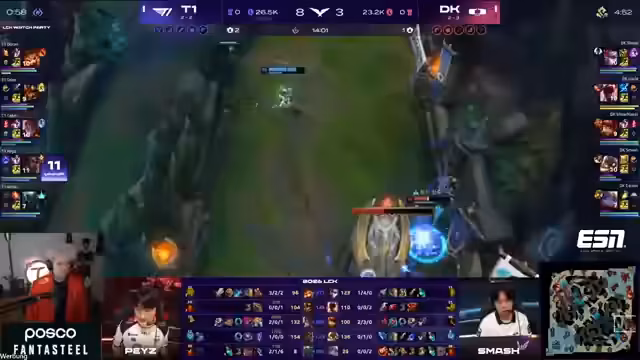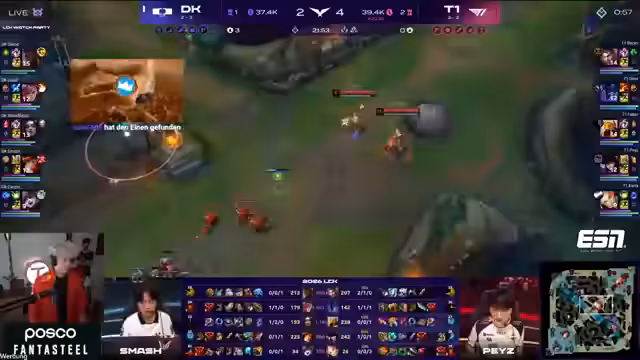 02:53:32Der Kampf um den vierten Drachen wird zum Wendepunkt des Spiels. Damwon führt einen perfekt zeitigen Engage durch, während T1 ohne Flash wichtige Champions wie Cassiopeia und Jhin nicht verteidigen kann. Zivo überlebt dreimal knapp mit 1 HP, was als glücklich, aber auch als verdient angesehen wird. Der 4-zu-0 Trade geht an Damwon, was ihnen den Drake und einen massiven Vorteil sichert. Dieser Kampf zeigt die überlegene Teamkampf-Koordination von Damwon und T1s unvorbereitete Reaktion auf Engages.
