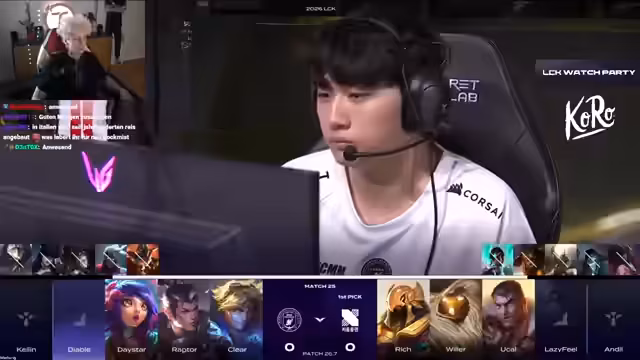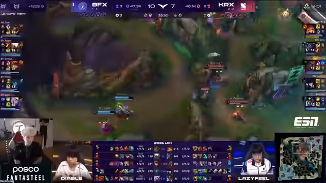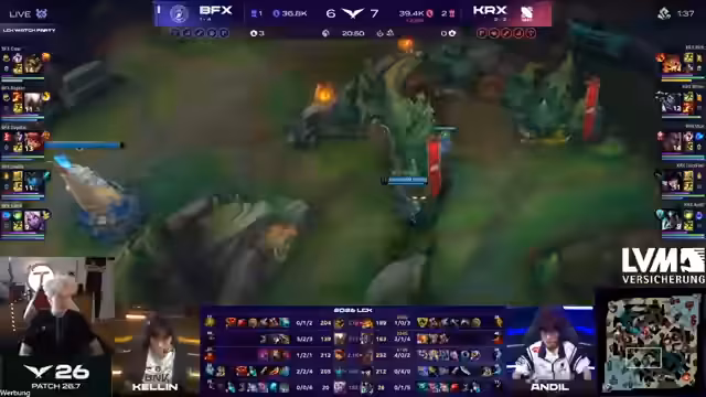 00:31:38Im ersten Spiel zwischen KDRX und BNK4X analysiert Tolkin den Draft. BNK4X entscheidet sich gegen Yorick und für einen ungewöhnlichen Kassadin-Pick, während KDRX Jace wählt. Tolkin äußert seine Frustration über den Jace-Pick, den er für useless hält. Im Early zeigt sich, dass KDRXs Top-Laner Clear gegen BNK4Xs Cassiopeia dominiert und mehrere Solo-Kills holt.