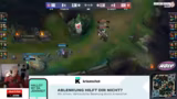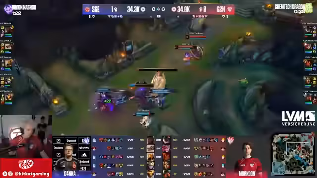 10:34:24Six zeigt starke Performance mit einem Pool-Party-Skin und kann nebenbei den Toben wegboxen. Sarko spielt berechnend mit der Kalkulation und hat noch keinen zweiten Punkt in W investiert. Tom wird getötet und Six wird durch den Shutdown reicher. Der nächste Butterleaf gelingt, was Stuttgart ins Spiel bringt. Schwickel gewinnt mit 1000 Schaden auf beiden Smites, während Jarvan noch Ult hat. Ein Flash-Versuch schlägt fehl, was als verkackt eingestuft wird.