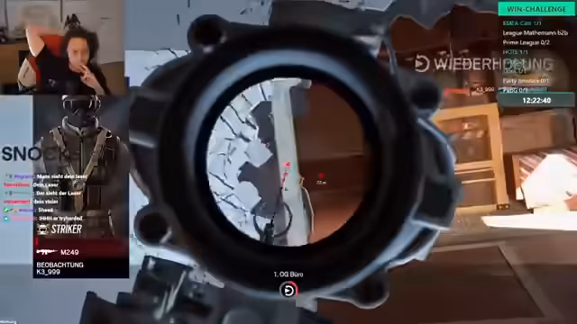 04:22:48Zu Beginn des Stream-Ausschnitts ist das Team in einem intensiven Feuergefecht verwickelt. Es kommt zu Verwirrung über die Positionen der Gegner, wobei ein plötzlicher Durchlauf eines Spielers durch den Crosshair bemerkt wird. Der Streamer analysiert die Situation und stellt fest, dass möglicherweise niemand sichtbar war. Das Team agiert nervös und unkoordiniert, was zu Fehlern wie versehentlichem Team-Killing und einem zerstörten Thermite-Gerät führt, das durch eine Felle an der Wand deaktiviert wurde.