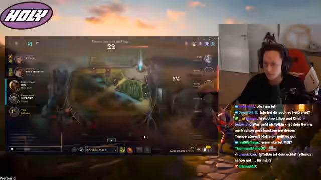 00:05:50Der Streamer wechselt zum Spiel League of Legends und spielt das Champion-Camille in der Top-Lane gegen Darius. Er analysiert das Matchup im Detail, erklärt die Vor- und Nachteile beider Champions auf verschiedenen Levels und der verschiedenen Spielverläufe. Parallel dazu bereitet er sich auf die bevorstehende Mid-Season Invitational (MSI) vor, die in fünf Tagen beginnt. Er diskutiert über Picks, Ergebnisse der Play-In-Stage und die damit verbundenen Erwartungen an die teilnehmenden Teams.