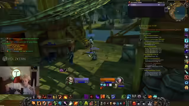 02:01:29Der Streamer fragt den Chat nach Rat, ob es sich bei einer Quest um eine Eskortaufgabe handelt. Nach der Bestätigung organisiert er die Durchführung mit der Hilfe des Chats, indem er auf das Verhalten der zu begleitenden NPC reagiert. Parallel dazu wird der Squad-Stream-Link geteilt, damit andere Spieler hinzustoßen können. Es wird über die anstehende Dungeon-Gruppe gesprochen und die Helfer (Jan, Terz) werden auf den aktuellen Status abgestimmt, um gemeinsam ins Kloster aufzubrechen.