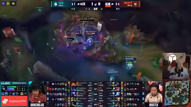 00:46:34Der Streamer kommentiert intensiv die Teamkämpfe und identifiziert strategische Fehler seitens der Teams. Besonders auffällig ist die Analyse eines erfolglosen Dives von SHFT, der zu einem klaren Goldvorteil für G2 führt. Der Streamer erklärt, wie kleine Fehler in der Teamkommunikation und Positionierung zu spürbaren Vorteilen führen können.