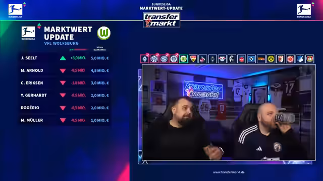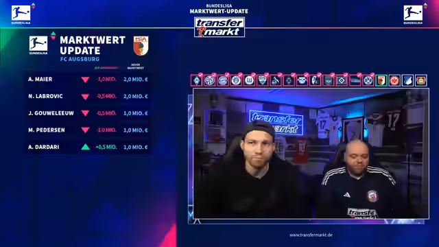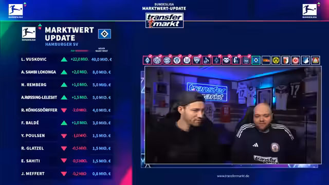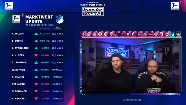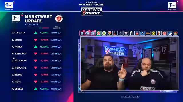 00:05:32Der Livestream beginnt mit einer Begrüßung der Zuschauer und der Ankündigung, dass die neuen Marktwerte der Bundesliga-Spieler nun online einsehbar sind. Es wird darauf hingewiesen, dass Tobi Kröger, der Marktwertkoordinator, in Kürze dazu stoßen wird, um die Updates detailliert zu erklären. Ein Highlight ist die Ankün¬digung des Deadline-Day-Streams im Februar, bei dem ein signiertes Trikot von Nadiem Amiri verlost wird. Zudem wird erwähnt, dass St. Pauli mit nur neun Änderungen im Update vergleichsweise wenige Anpassungen hat und der Fokus generell auf Talentaufwertungen liegt.
