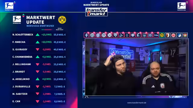 03:12:06Nico Schlotterbeck erhält mit 55 Mio. Euro den dritthöchsten Marktwert für einen deutschen Innenverteidiger. Felix Nmecha wird nach starken Leistungen aufgewertet, während Gerasi aufgrund schwacher Torbilanz leicht abgewertet wird. Diskussionen um die Zukunft von Julian Brandt und Duran Will, dessen Verletzungspech den Wert drückt. Niklas Süle verliert an Wert, während junge Talente wie Sabitzer und Shan altersbedingt angepasst werden.